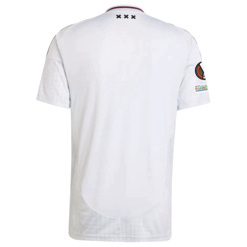 A nova terceira camisa do Ajax é branca e traz linhas em gráfico em cinza visto ao longo do corpo do manto, com inspiração na Escola de Amsterdã.A gola é redonda e traz friso bordô na nuca, já as três listras alternam o bordô e o preto. O escudo do Ajax é aplicado em bordô no lado esquerdo o peito, enquanto o logo da Adidas ganha a mesma cor no lado direito, o mesmo acontece com o patrocínio master.Os arcos do template, que recortam a parte inferior lateral, também são vistos em bordô. Já na nuca, as cruzes de Santo André, os três “X”, símbolo da cidade, são aplicados na nuca. Nesta versão a camisa acompanha os Patchs de participação na Europa League 2024/25.