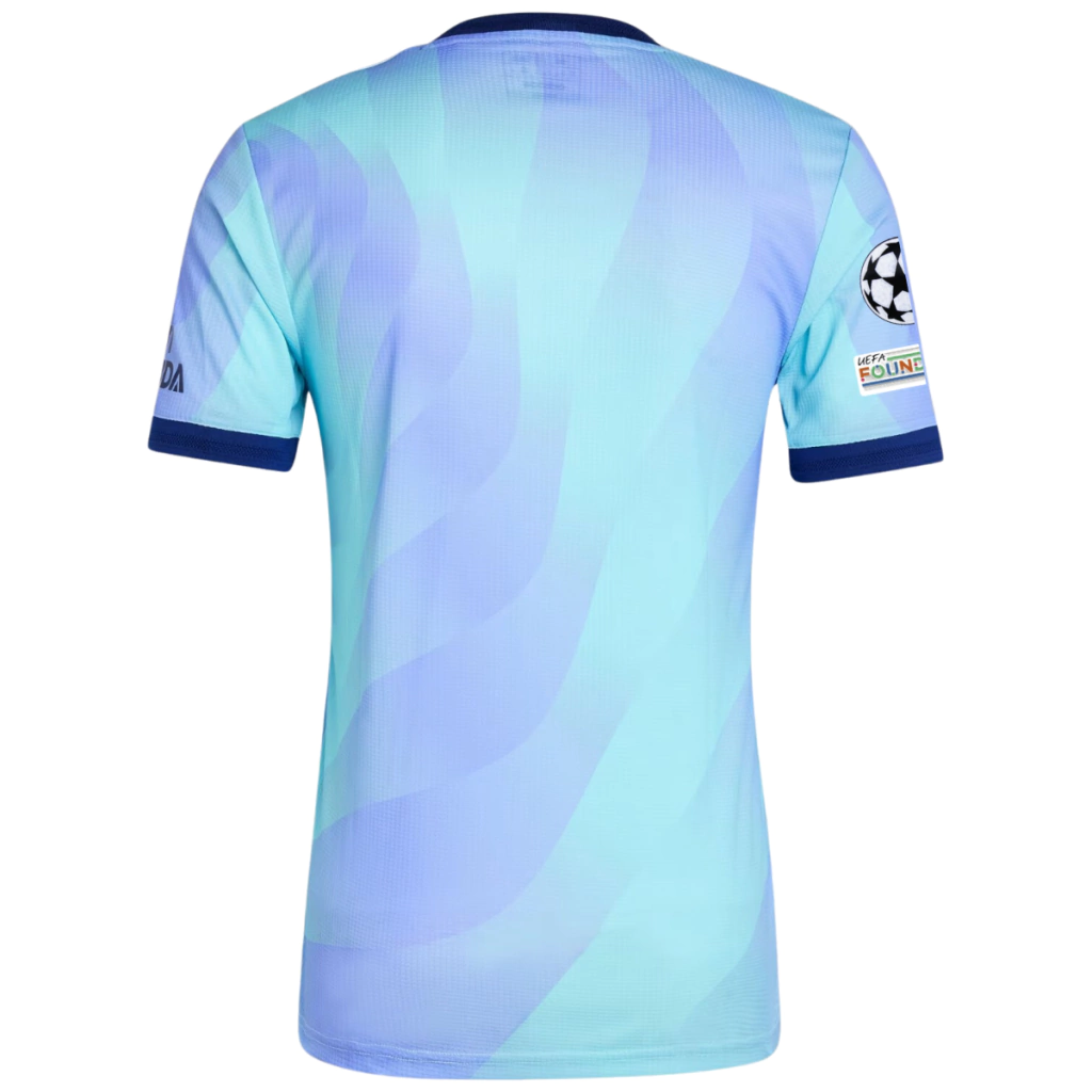 A nova terceira camisa do Arsenal traz a cor azul clara, misturado com tons de lilás também claros, que se misturam em degrade formando um design “líquido”. Segundo a Adidas, o novo uniforme celebra a evolução da “originalidade”, desde os jogadores até a torcida. gola é redonda, em azul petróleo, cor que também é aplicada nos punhos e nas três listras. O escudo é representado pelo canhão e o logo da Adidas, pelo tradicional trevo, hoje usado na linha Originals. O patrocínio master e o da manga, também aparecem em azul petróleo. Nesta versão a camisa acompanha os Patchs de participação naChampions League 2024/25.