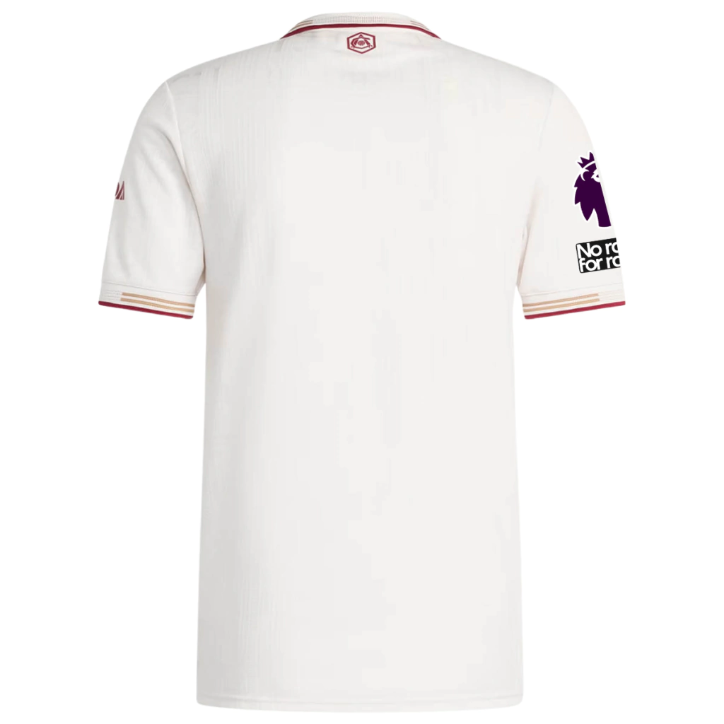 A nova terceira camisa do Arsenal para a temporada 25/26 traz uma proposta elegante e nostálgica, combinando tradição e sofisticação em um design que homenageia o lendário estádio de Highbury. Com predominância da cor off-white, o manto é confeccionado em um tecido técnico sob medida, que incorpora grafismos sutis inspirados na arquitetura externa do antigo estádio. Os detalhes em bordô e dourado marcam presença na gola polo e nos punhos, enquanto as clássicas três listras da adidas surgem nos ombros em um tom bordô sóbrio. O escudo do clube aparece em sua versão com o canhão, acompanhado dos logotipos dos patrocinadores e do icônico Trefoil da adidas Originals, todos aplicados em bordô monocromático — um retorno que reforça a conexão com a herança esportiva da marca. No interior da peça, uma ilustração exclusiva da fachada de Highbury acompanha uma inscrição especial, criando uma ponte emocional entre o passado e o presente. Esse detalhe é pensado especialmente para os torcedores mais jovens, que conheceram o estádio apenas por meio das histórias e do imaginário coletivo do clube. Muito mais do que um uniforme alternativo, esta camisa é uma celebração viva da identidade e da alma do Arsenal. nesta versãoa camisa acompanha o patch de participação na Premier League.
