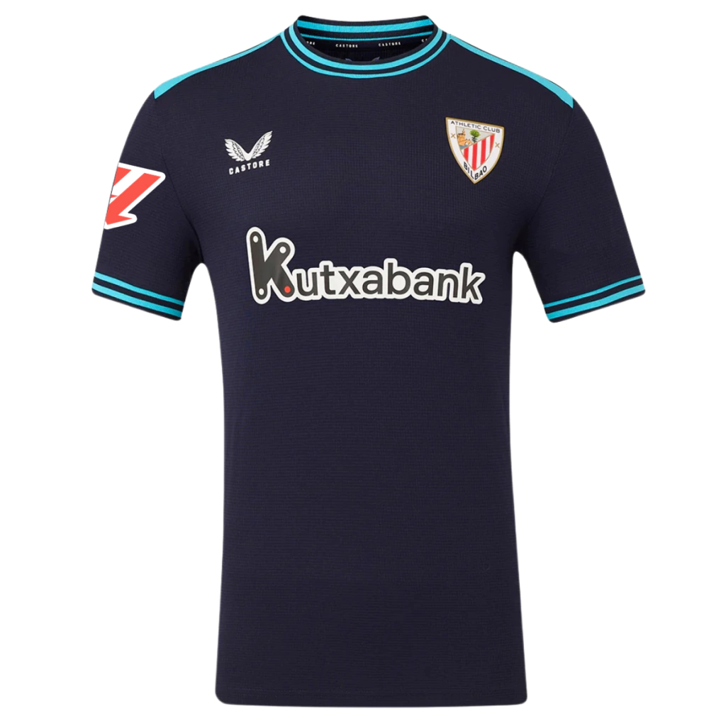 A nova camisa reserva do Athletic Club de Bilbao para a temporada 25/26 resgata um visual clássico e simbólico da história do clube. Com predominância do azul marinho, em tom quase preto, a peça ganha destaque com faixas azul celeste nos ombros, gola redonda e punhos, além de finas listras laterais no mesmo tom, proporcionando um visual moderno e elegante. Essa combinação de cores não é inédita: o azul foi utilizado como principal cor reserva em diversos momentos históricos, incluindo a final da Copa da UEFA de 1977 contra a Juventus, a vitória sobre o Standard de Liège em 2004, e a importante classificação à Champions League em 2024, contra o Valencia. No lado esquerdo do peito está o escudo oficial do clube em sua versão atual, enquanto o logo da Castore aparece no lado direito, em branco. Um toque especial está na nuca, onde a tradicional bandeira basca (Ikurriña) é combinada ao eguzkilore, flor típica do País Basco, usada como amuleto de proteção. Nesta versão a camisa acompanha o patch de participação na La Liga.