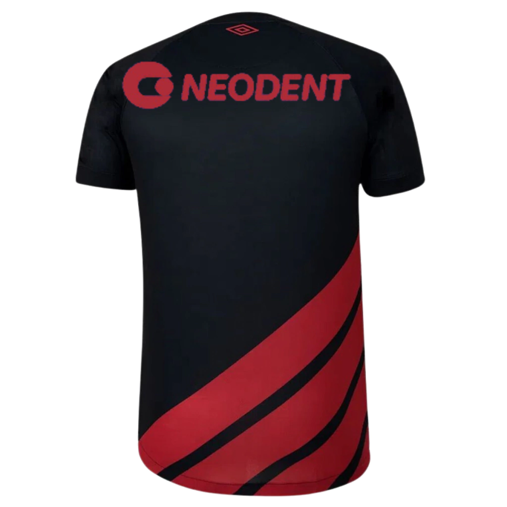 A nova camisa do Athetico Paranaense 2023 mantém o visual baseado no emblema da camisa home, mas numa cor preta e vermelha . Desta vez, os punhos e a cor combinam com o resto do tronco.