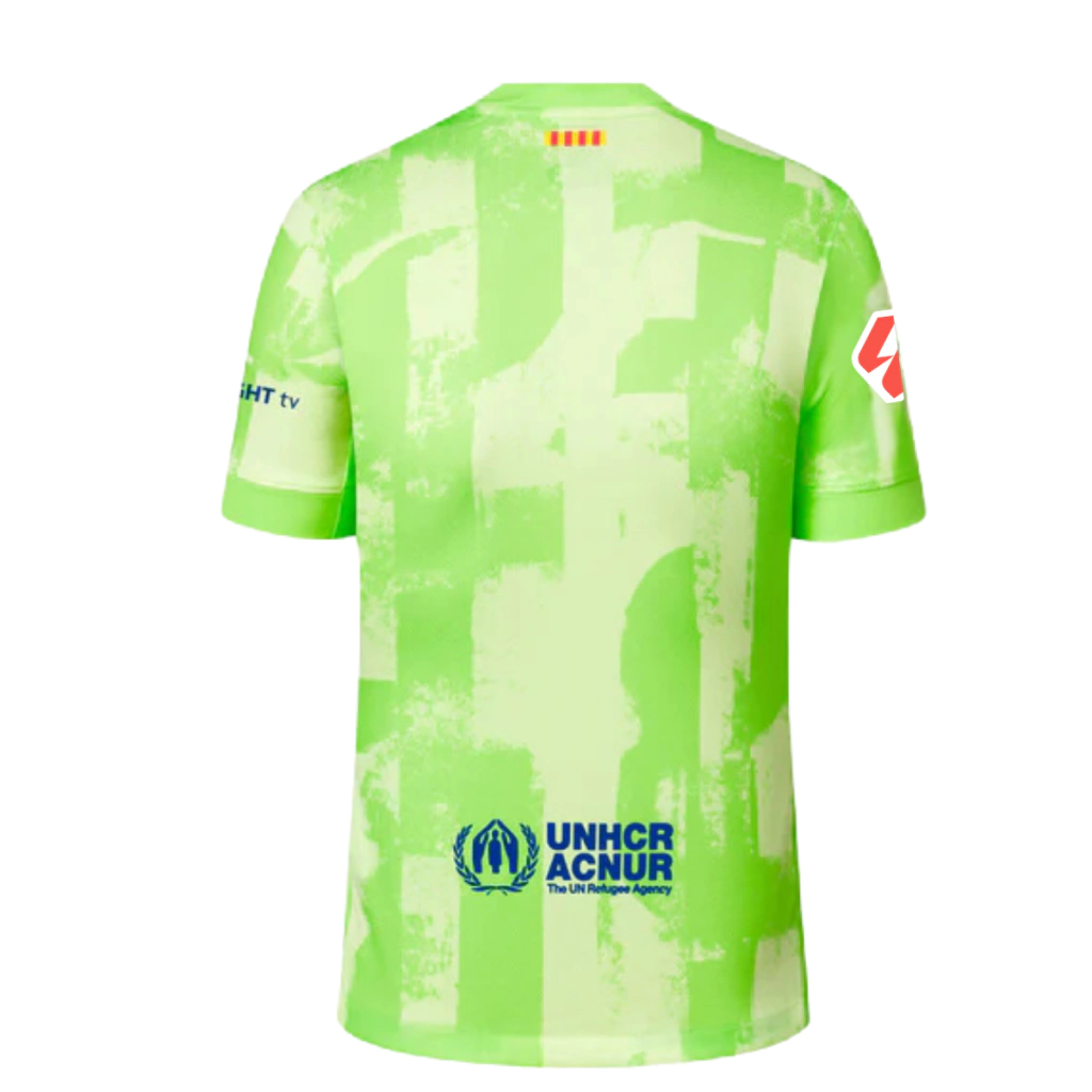 A nova camisa alternativa do Barcelona traz o template padrão da marca para os mantos thirds e apresenta diversos tons de verde, que, segundo o time, é conhecido por sua conexão com esperança e renascimento.No corpo, são colocados diversos símbolos, como a cruz do escudo e algumas letras. A gola é a redonda padrão, em verde, assim como os punhos. No interior da gola vai o selo de 125 anos do clube.Como nos outros modelos third, a Nike estampa o Swoosh na vertical, em azul, com um menor em vermelho no interior. Nesta versão a camisa acompanha o patch de participação na La Liga 2024/25.