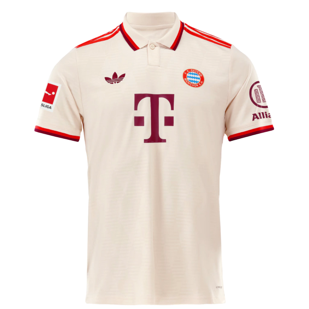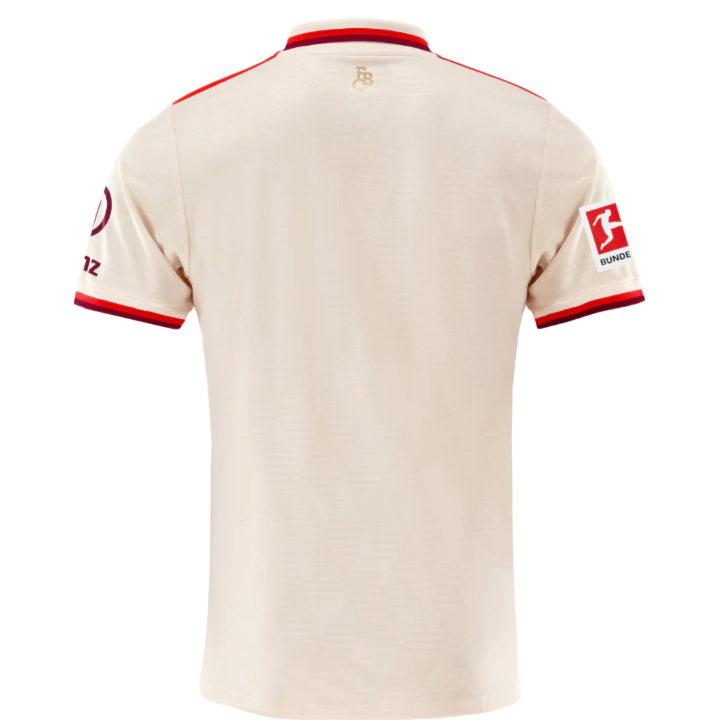 O novo “third kit” dos Bávaros traz como destaque, o retorno do “trefoil”, o logo do trevo da Adidas. Ele se une aos uniformes titular e reserva, já anteriormente revelados. A nova camisa três do Bayern foi batizada como “UCL Kit” e traz a cor bege predominante, com gola polo com botão, acompanhada por frisos vermelhos e bordô nas pontas, padrão que se repete nos punhos. Ao longo do corpo do manto é visto um padrão em jacquard com diamantes em degrade. O escudo é aplicado em uma versão retrô no lado esquerdo, com o modelo usado entre 1970 e 1979. Já o trefoil ganha o bordô, no lado direito, cor também vista no patrocínio master. As três listras percorrem os ombros em vermelho, enquanto na nuca, a sigla “FCB” aparece em bordô.Nesta versão a camisa acompanha o patch de participação na Bundesliga 2024/25.
