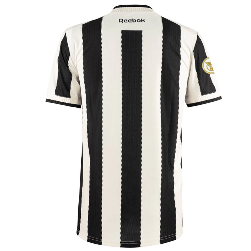 A nova camisa titular do Botafogo foi batizada como “Honrar o Passado” e traz o tradicional listrado vertical com uma textura em “zigue-zague” que simula o tecido de tricô, usado nos anos 50 e 60, com o branco puxado levemente para o off-white, para lembrar peças mais antigas.A gola é V na cor branca, com bordas pretas, padrão que se repete nos punhos. As mangas são listradas mas tem a parte superior branca.O escudo do Fogão é aplicado em TPU no lado esquerdo do peito, enquanto o logo da Reebok ganha a cor branca com contorno preto, no lado direito.Nesta versão a camisa acompanha o patch de participação no Campeonato Brasileiro 2024.