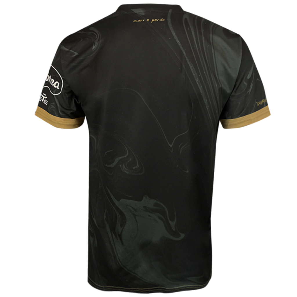 A nova camisa alternativa do Cagliari Calcio traz o preto como predominante, com um gráfico em cinza inspirado na pedra. A gola V segue a mesma cor, enquanto os punhos são dourados. Na nuca, é escrita a frase “Mari e Perda”, símbolo de tenacidade e força, sendo que o mar representa a resistência e a pedra obsidiana, simbolizando força e maleabilidade.O escudo está no lado esquerdo do peito, em uma versão minimalista branca, enquanto o logo da Eye aparece no lado direito, na mesma cor. O mesmo acontece com os patrocinadores.