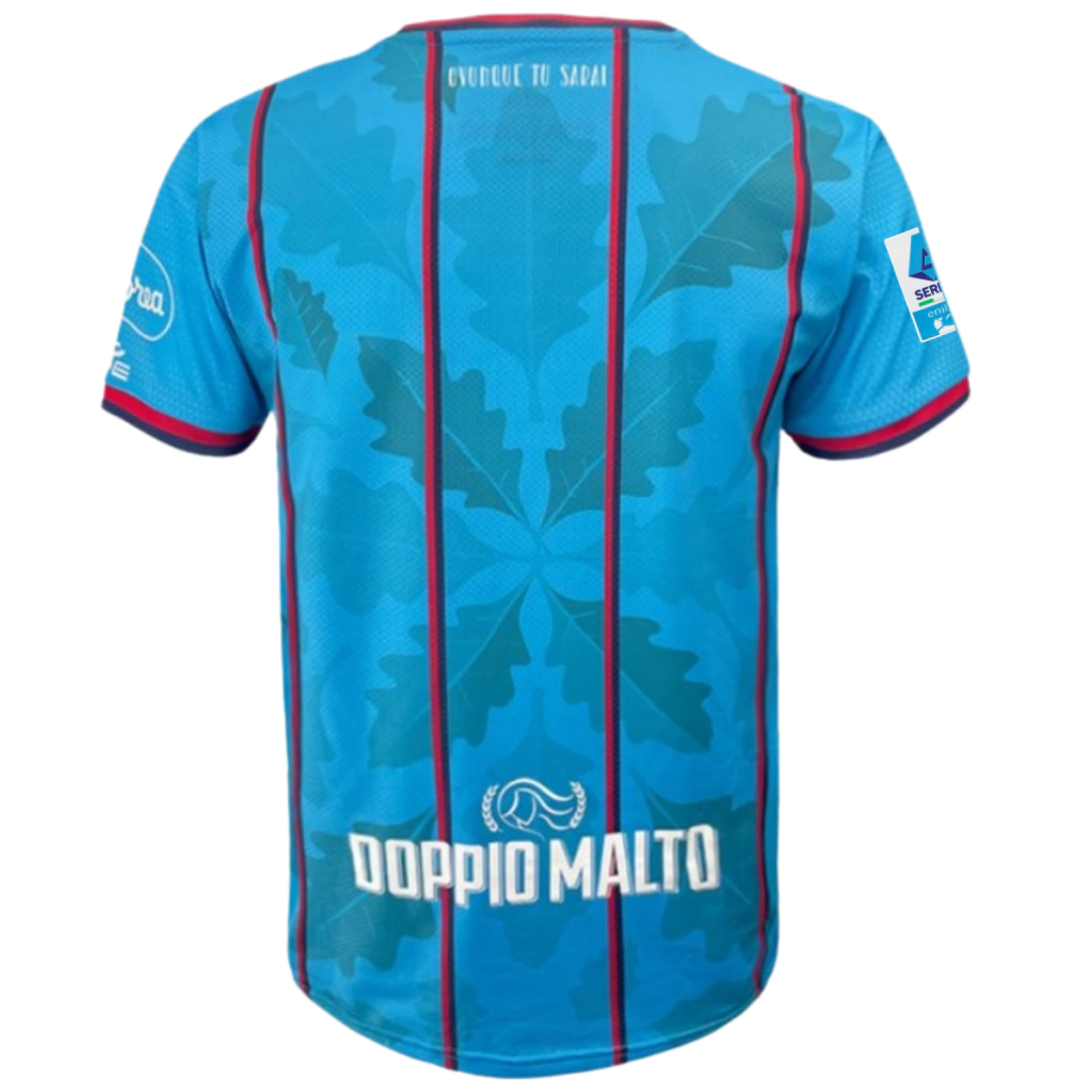 A Camisa Cagliari III 25/26 - Torcedor Masculina celebra a essência da Sardenha com um design que combina tradição, identidade e inovação. Predominantemente ciano, o modelo traz listras verticais centrais em vermelho e azul — cores emblemáticas do clube. O grande destaque fica por conta das estampas de folhas típicas da flora sarda: azinheira na parte frontal, e carvalho-negral e sobreiro nas costas, em referência às raízes naturais e culturais da região. O escudo do Cagliari e o logo da fornecedora EYE Sport aparecem no peito em silicone leve, oferecendo acabamento premium. A gola é redonda com detalhe canelado elástico em tons sociais do clube. Outro diferencial é a etiqueta NFC posicionada na barra inferior, permitindo a verificação de autenticidade digital da peça. nesta versão a camisa acompaha o patch de partipação no Campeonato Italiano.