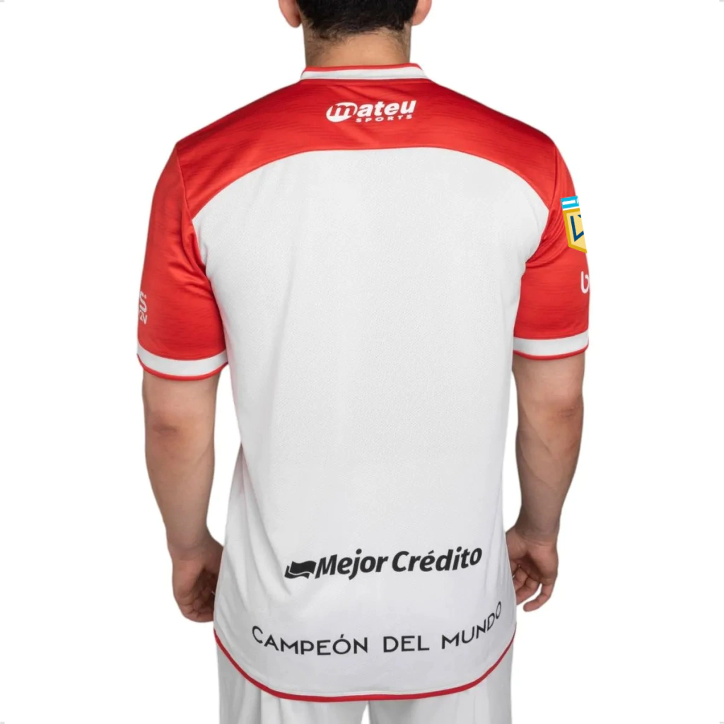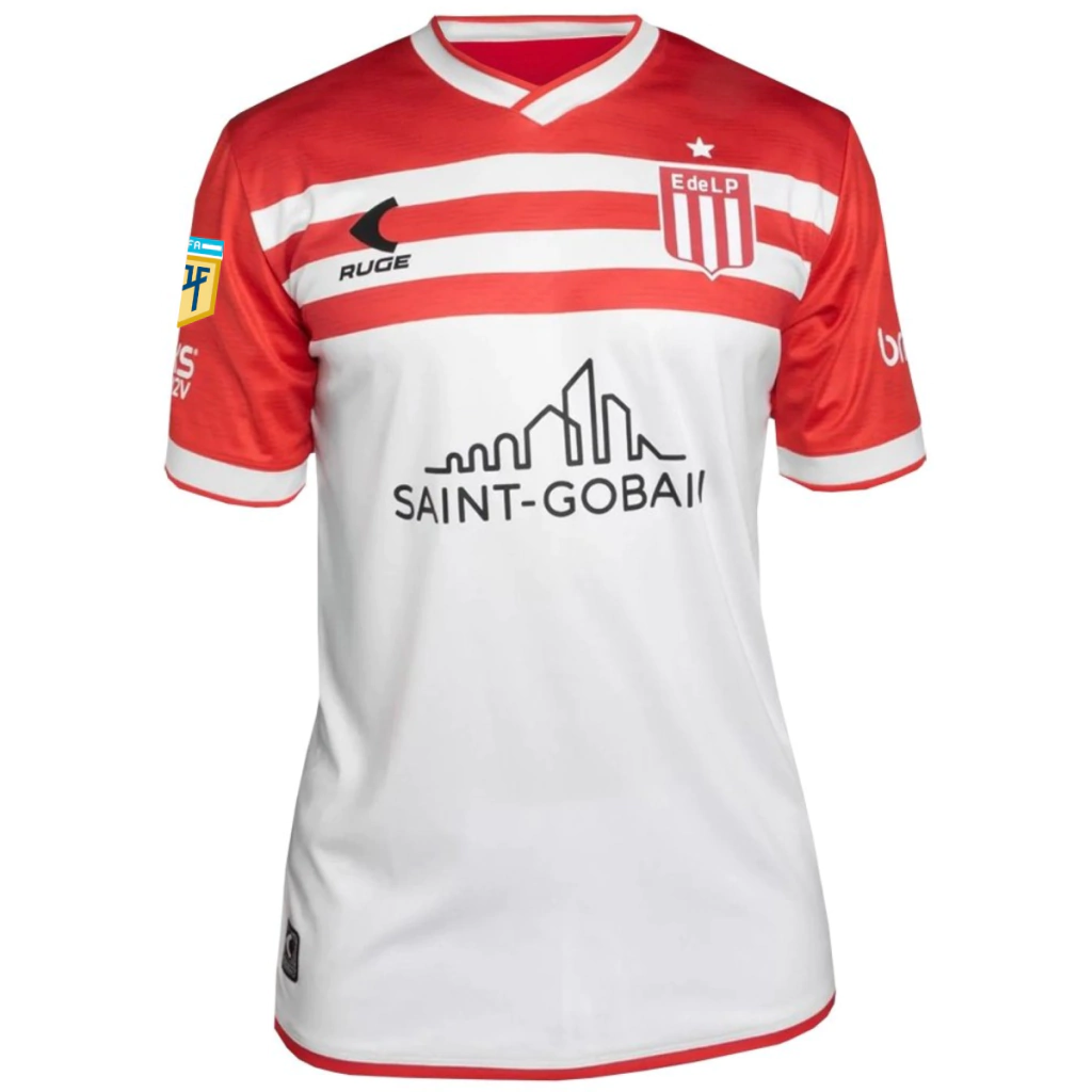 O novo uniforme reserva do Estudiantes tem o branco como cor principal e se destaca pelos detalhes em vermelho nas mangas, ombros e na parte superior do peito. Logo abaixo, duas faixas horizontais vermelhas complementam o design. A gola em formato V com sobreposição é branca, com contorno vermelho, padrão que também se repete nos punhos. O logo da Ruge aparece em preto no lado direito do peito, enquanto o escudo tradicional do clube está posicionado no lado esquerdo.