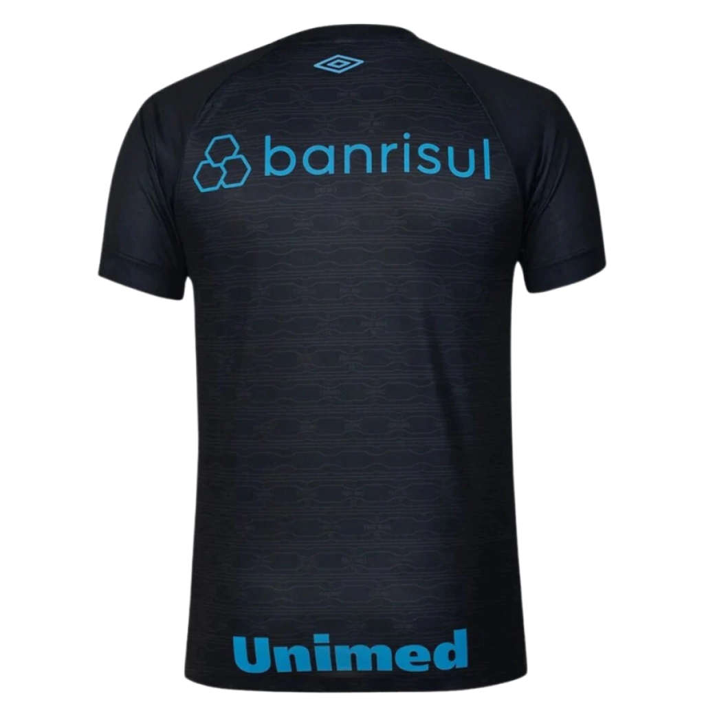 A nova terceira camisa do Grêmio para a temporada é preta e traz como destaque, o escudo estilizado em relevo ao longo de todo o corpo do manto.A gola é redonda com a parte frontal azul e a nuca preta, enquanto os ombros e mangas são pretos com uma linha azul, percorrendo até os punhos.