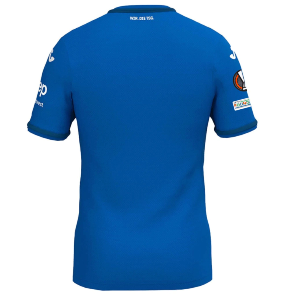 A nova camisa titular do Hoffenheim para a temporada traz de volta, como diz o próprio clube, seu ousado azul royal. Agora, o manto se destaca por linhas verticais em azul marinho, vistas a partir da região da barriga. O tom mais escuro do azul, também é visto na gola redonda e nos punhos.O escudo do TSG 1899 está no lado esquerdo do peito, enquanto o logo da Joma aparece em branco no lado direito e também nos ombros. A mesma cor está nos patrocinadores. Nesta versão a camisa acompanha o patch de participação na Europa League 2024/25.