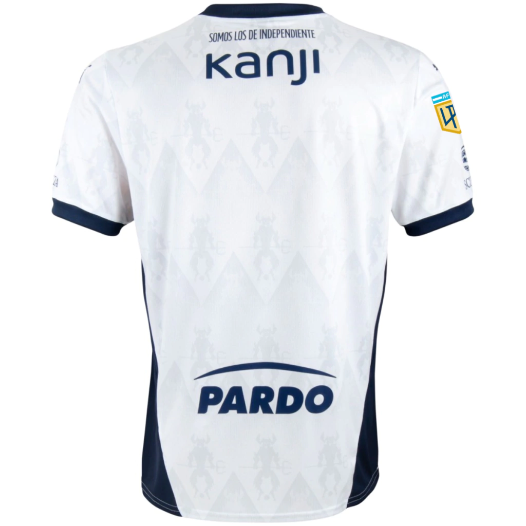 A camisa reserva do Independiente é branca e traz um gráfico frontal em tom sobre tom com triângulos em degradê e diversos diabos, mascote do clube em positivo/negativo nas cores. Faixas laterais, punhos e a nuca têm a cor azul marinho, enquanto o vértice da gola V é branca. Na nuca, vai a frase “Somos los de Independiente”.A Puma estampa o felino em azul marinho, nas mangas e no lado direito do peito, enquanto o escudo retrô do clube vai no lado esquerdo em uma versão branca e azul. Os patrocínios também ganham a cor azul marinho. Nesta versão a camisa acompanha os patchs de participação no Campeonato Argentino.