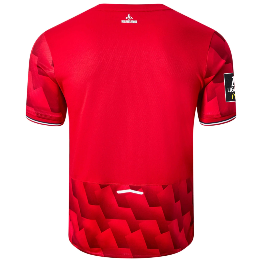A Camisa Lille I 25/26 - Torcedor Masculina - Vermelha é uma homenagem elegante à história e arquitetura da cidade de Lille. Inspirado na imponente Cidadela de Lille, cuja silhueta também está presente no escudo do clube, o novo uniforme traz um visual único e cheio de significado. O manto é predominantemente vermelho, com um padrão de figuras geométricas em tons sutis da mesma cor, remetendo às linhas e formas da fortificação projetada por Vauban no século XVII. A gola em formato V acompanha o tom vermelho, mas se destaca pelo detalhe azul e branco no vértice, criando um contraste moderno e sofisticado. O escudo oficial do LOSC Lille está aplicado no lado esquerdo do peito, enquanto o logo da New Balance aparece em branco no lado direito. É uma peça pensada para o torcedor que valoriza tanto o orgulho pelo clube quanto a história da cidade. Nesta versão a camisa acompanha o patch de participação na Ligue 1.