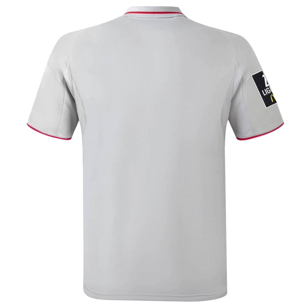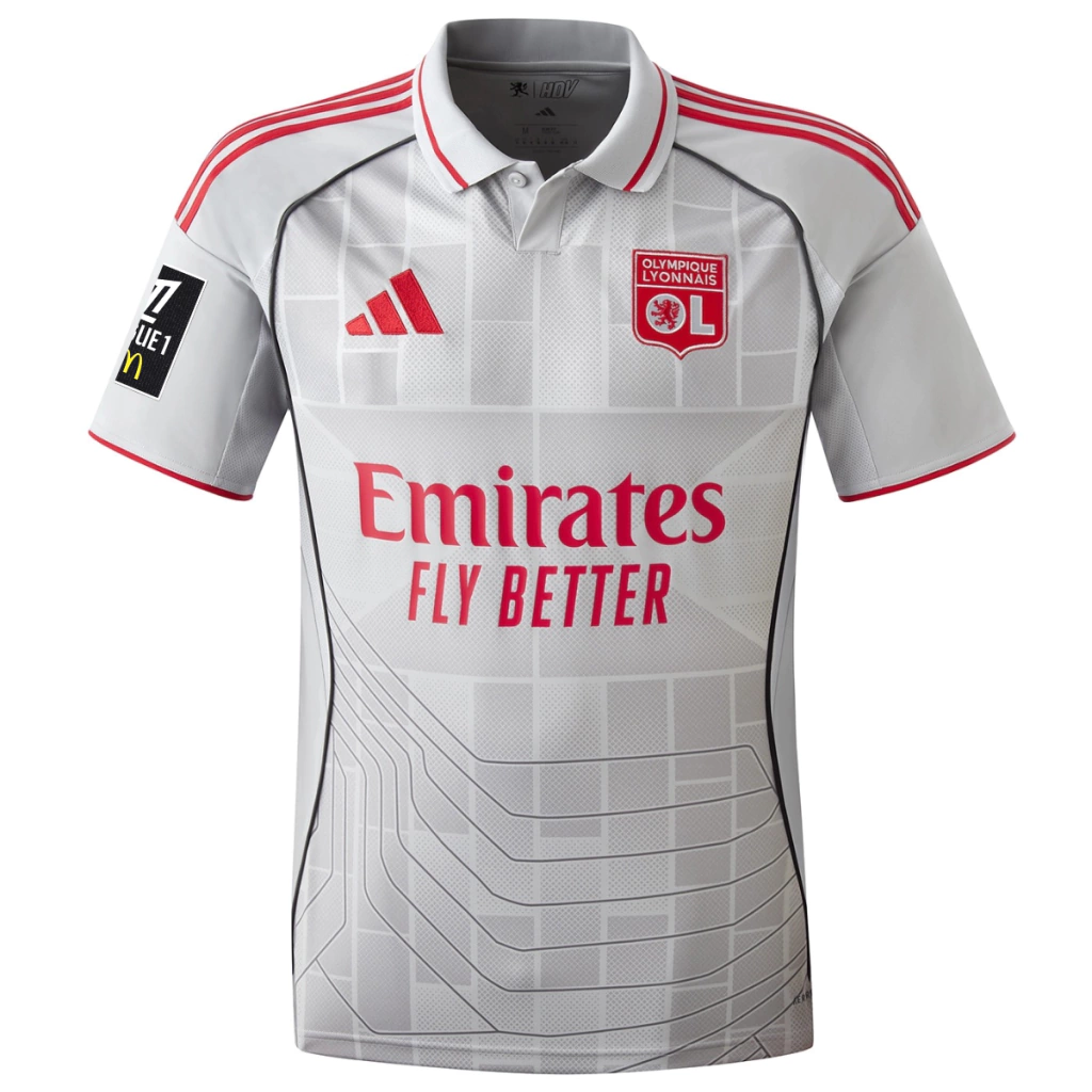 A nova terceira camisa do Lyon 25/26 traz como inspiração o Place Louis Pradel, conhecido como “Hôtel de Ville”, referência mundial entre skatistas. O uniforme tem o cinza como cor predominante, simbolizando as pedras do calçamento da praça, e conta com um padrão gráfico que reproduz as linhas dos degraus icônicos do local. Um arco em preto percorre a parte frontal, enquanto as três listras da adidas nas mangas e os punhos surgem em vermelho, criando contraste marcante. A gola estilo pólo, em cinza com faixa vermelha, traz no interior as iniciais HDV, em alusão ao Hôtel de Ville. O escudo do Lyon aparece do lado esquerdo do peito em uma versão especial em cinza e vermelho, combinando com o logo da adidas aplicado do lado direito. Nesta versão a camisa acompanha o patch de participação na Ligue 1.