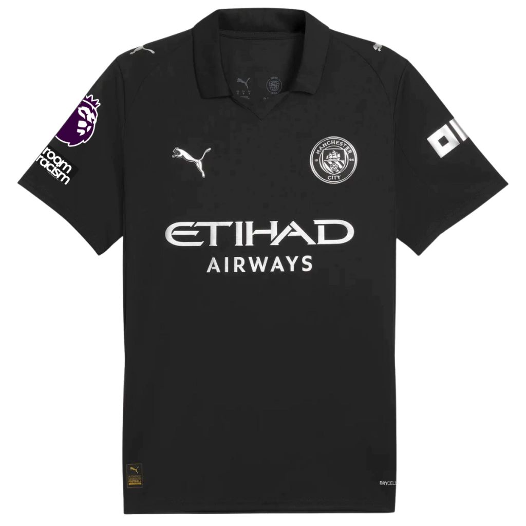 A nova camisa alternativa do Manchester City 25/26 aposta em um visual totalmente preto, que resgata a essência do primeiro manto do clube com uma abordagem moderna, minimalista e elegante. O design transmite sofisticação com um toque histórico, ideal para os torcedores que valorizam tradição e estilo. O grande destaque fica por conta do escudo redesenhado e dos detalhes em prata metálica, que criam um contraste marcante com a base escura, adicionando um acabamento refinado e atemporal. A gola tradicional com detalhe branco remete ao estilo clássico do século XIX, reforçando o elo com as origens do City. Os acabamentos precisos elevam a estética do uniforme e reforçam a identidade visual do clube com elegância. Um manto que une passado e presente em um visual discreto, sofisticado e cheio de significado — feito para quem veste o Manchester City com orgulho em qualquer ocasião. Nesta versão a camisa acompanha os patch de participação na Premeir League.