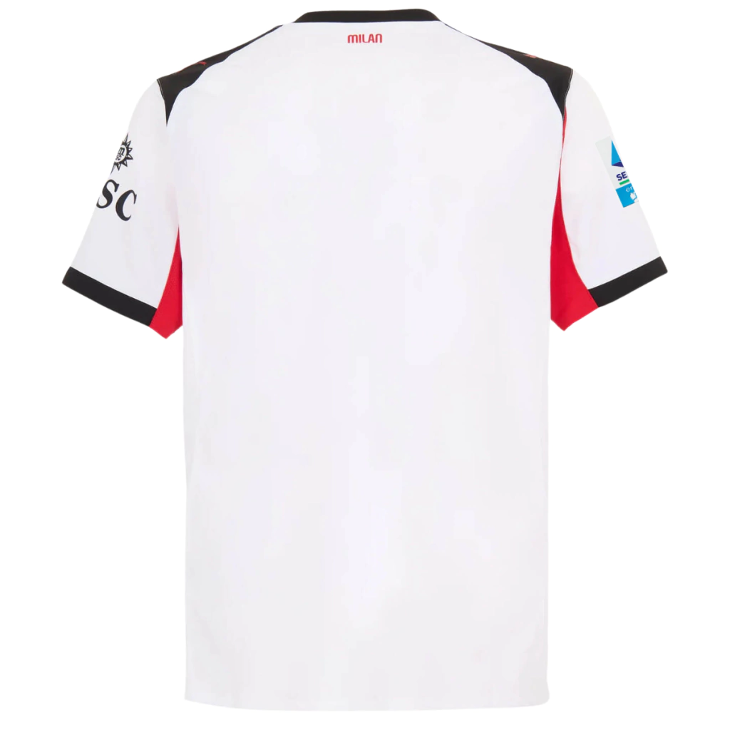 A nova camisa reserva do AC Milan para a temporada 2025/26 é uma fusão de ousadia, história e identidade. Com base branca predominante, o design moderno traz detalhes agressivos em preto e vermelho, evocando a paixão, a intensidade e o espírito combativo do clube italiano. O grande destaque desta edição é o retorno do Diavoletto, o icônico pequeno diabo que marcou época nos anos 1980 e agora ressurge em versão estilizada e totalmente vermelha no escudo, reforçando o DNA rebelde e destemido do Milan. A gola redonda em preto acompanha o tom dos ombros, da parte superior dos punhos e dos patrocinadores, enquanto o vermelho aparece com força nas axilas, no logo da Puma e também no nome do clube bordado na nuca. Com design dinâmico, tecido respirável e modelagem confortável, esta versão torcedor é ideal para quem vive o Milan com intensidade — nas arquibancadas, nas ruas ou nas coleções. nesta versão a camisa acompanha o patch de participação na Serie A.