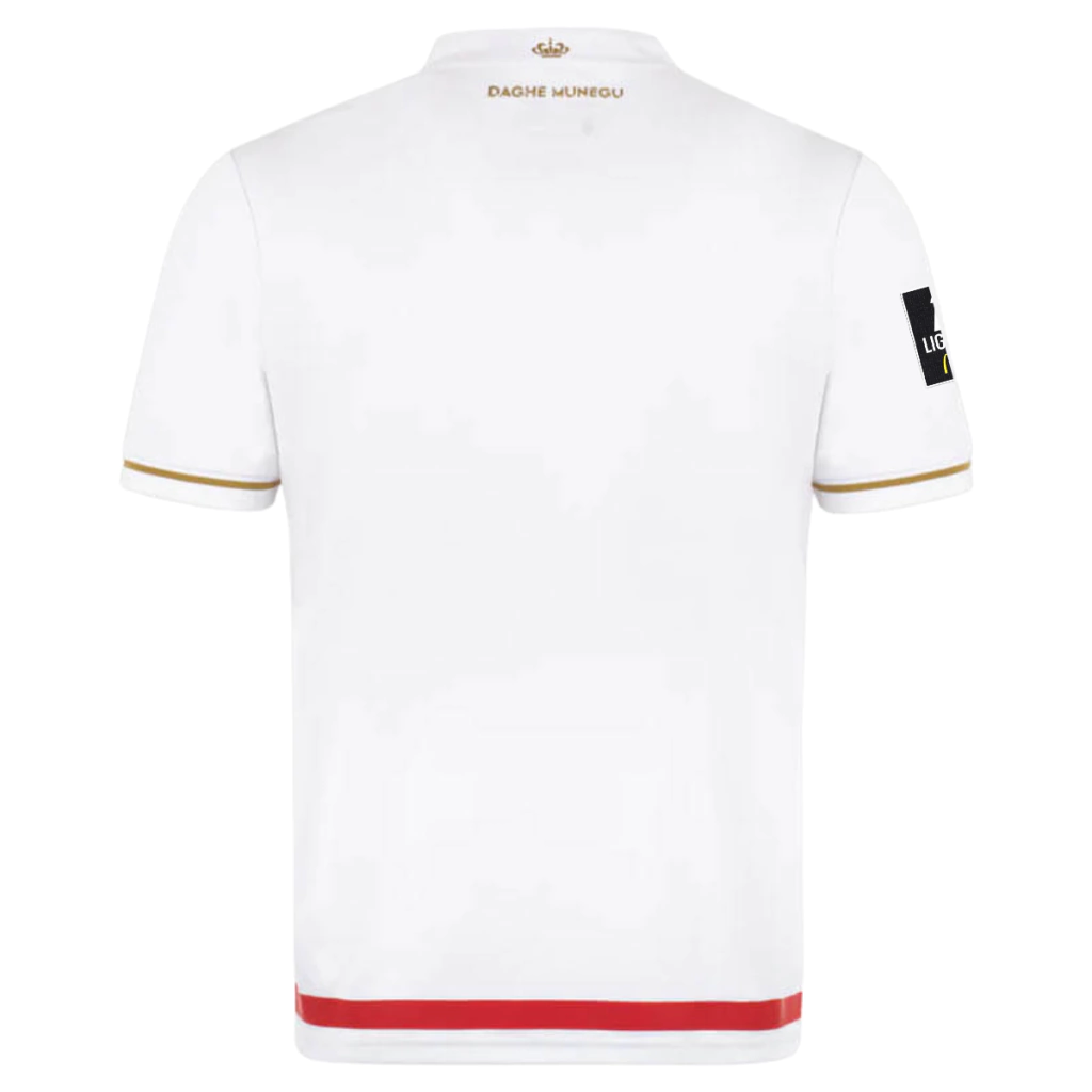 A nova camisa titular do AS Monaco 25/26 celebra a elegância e a história de um dos designs mais icônicos do futebol mundial. Com o tradicional corte diagonal em vermelho e branco — criado por Grace Kelly em 1960 — o manto ganha ainda mais personalidade nesta versão com listras verticais em relevo sobre a faixa, relembrando os uniformes históricos que marcaram a conquista da Copa da França naquele mesmo ano. A gola, inspirada no estilo japonês, oferece um toque contemporâneo ao visual clássico, enquanto os detalhes dourados nas mangas e na frase “Daghe Munegu” (Força, Mônaco) na nuca elevam o nível de sofisticação. O escudo do clube é bordado sobre o lado esquerdo do peito, enquanto o logo “Runbird” da Mizuno aparece do lado direito, em branco — cor também utilizada no patrocínio máster. As costas são totalmente brancas, com nome e número dos atletas em vermelho. Já as faixas vermelhas discretas nos ombros e na parte inferior das costas fazem referência à bandeira do Principado de Mônaco, reforçando o vínculo entre clube e nação.