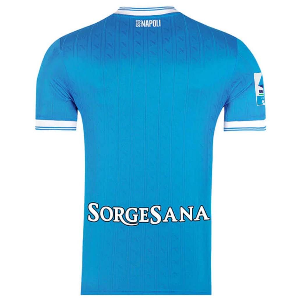A nova camisa titular do Napoli 25/26 mantém o tradicional azul celeste que é marca registrada do clube, agora com um toque moderno e simbólico. O grande destaque fica por conta das faixas verticais em relevo com o "N" do escudo, aplicadas em todo o corpo do manto, criando uma textura única que reforça a identidade visual da equipe. A gola em formato V e os punhos aparecem em branco com dupla faixa azul celeste, trazendo contraste e elegância ao design. O escudo do Napoli é aplicado em branco no lado esquerdo do peito, enquanto o logo da EA7 e o patrocínio da MSC surgem na mesma cor, garantindo um visual limpo e harmônico. O badge de campeão italiano, aplicado ao centro do peito, coroa o uniforme com orgulho e prestígio. Na nuca, o nome do time completa os detalhes com um toque de pertencimento. Um manto que celebra conquistas, tradição e paixão — feito para quem carrega o Napoli no coração. Nesta versão a camisa acompanha o patch de participação na Serie A.