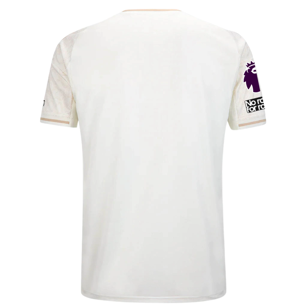 A nova camisa reserva do Nottingham Forest 25/26 homenageia um dos maiores símbolos culturais da cidade: a tradicional renda de Nottingham, que ganhou destaque mundial no século XIX. O design conecta o clube à sua herança local, transformando história em identidade visual. O uniforme tem como base a cor off-white, adornado por um padrão gráfico rendado que incorpora o brasão do clube e o código postal do City Ground, representando de forma simbólica a união entre o Forest e a cultura da cidade. Detalhes em tom mais escuro aparecem nas laterais da gola, nas três listras da adidas, nos punhos e em recortes que percorrem as laterais até a barra. O escudo do Nottingham Forest, o logo da adidas e os patrocinadores — incluindo o novo máster Bally’s — são aplicados em preto, criando um contraste elegante que valoriza ainda mais o conceito do manto.