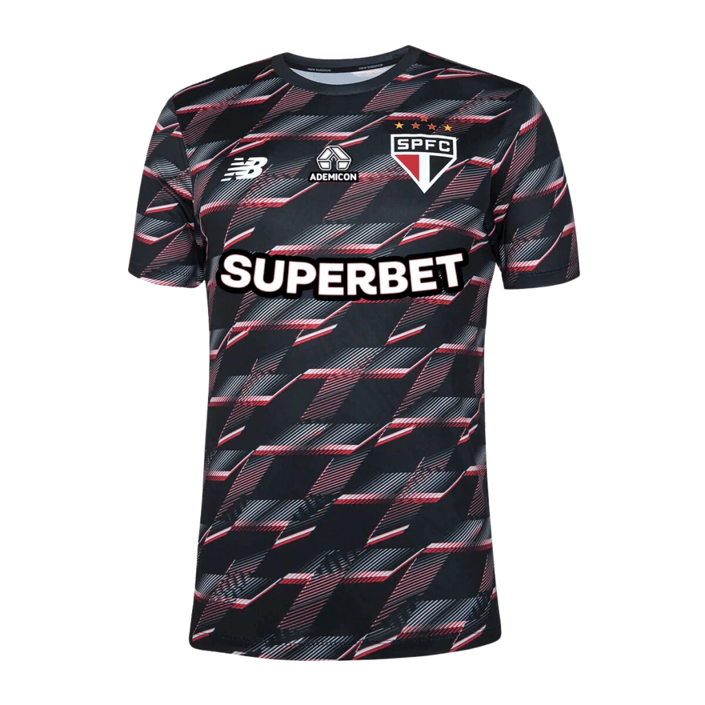 A camisa de aquecimento do São Paulo, que é usado pelos jogadores no pré-jogo, traz um design bem moderno e interessante, com a base preta e gráficos em cinza, vermelho e preto que formam figuras geométricas abstratas em 3D.