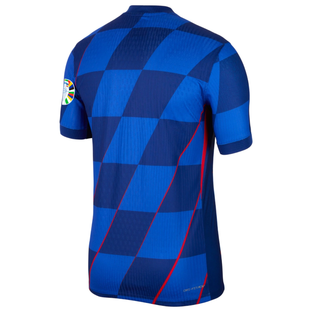 A nova camisa reserva é azul escura e tem um padrão xadrez inclinado, em tom sobre tom, que é inspirado no time que conseguiu um terceiro lugar na Copa de 1998, no primeiro mundial disputado pelo país.A gola é redonda em azul escuro, mesmo padrão visto nos punhos, enquanto na parte inferior e nas laterais do kit, são vistas linhas vermelhas.Nesta versão a camisa acompanha os patchs de participação na Eurocopa 2024.