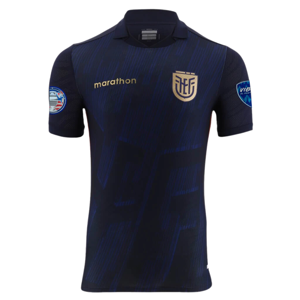 A nova camisa três do Equador traz o azul marinho predominante e apresenta no corpo um grafismo com o FEF do escudo em larga escala, formado por linhas azul royal, como uma chuva de meteoros no céu. A gola pólo segue a cor predominante, enquanto as faixas laterais trazem as cores vermelha e amarela. Na nuca, a sigla “EC”, que se refere ao país, é vista com a silhueta do mapa nacional.Nesta versão a camisa acompanha os Patchs de participação na Copa América 2024.