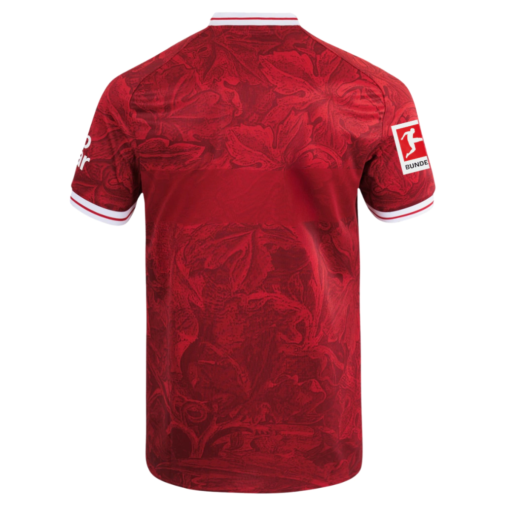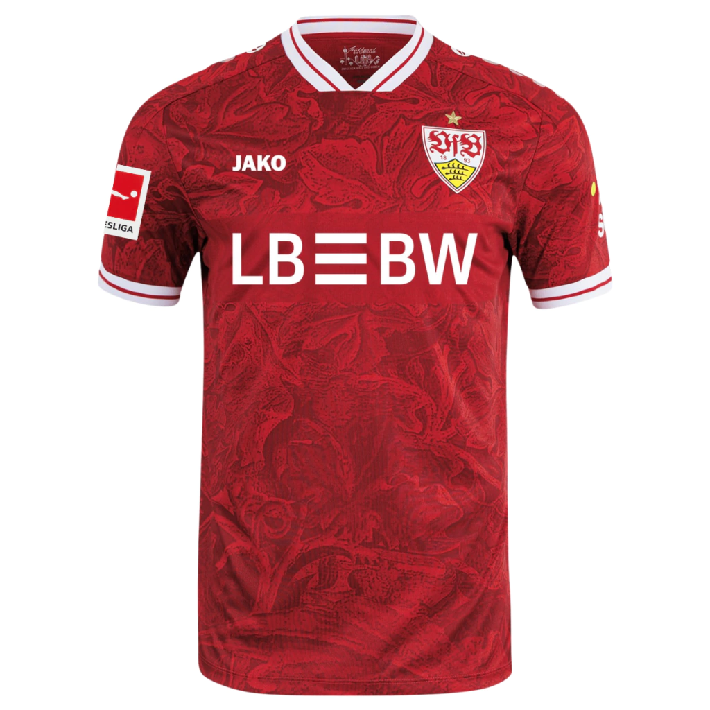 A nova camisa reserva do VfB Stuttgart para a temporada 25/26 traz um visual sofisticado e cheio de significado, com o vermelho como cor predominante. O destaque fica para o padrão gráfico no corpo, que apresenta um desenho abstrato de videira — uma homenagem às florestas, vinhedos e à bacia hidrográfica que caracterizam a cidade de Stuttgart. A gola no formato EQT é branca com uma fina linha vermelha, padrão que também se repete nos punhos, garantindo um contraste elegante. A tradicional faixa horizontal do clube aparece em um tom de vermelho quase imperceptível, contornando o corpo na altura do peito e das costas. O logo da Jako é aplicado em branco nas mangas e no lado direito do peito, enquanto o escudo oficial do Stuttgart ocupa o lado esquerdo, em sua versão atual. Nesta versão a camisa acompanha o patch de participação na Bundesliga.
