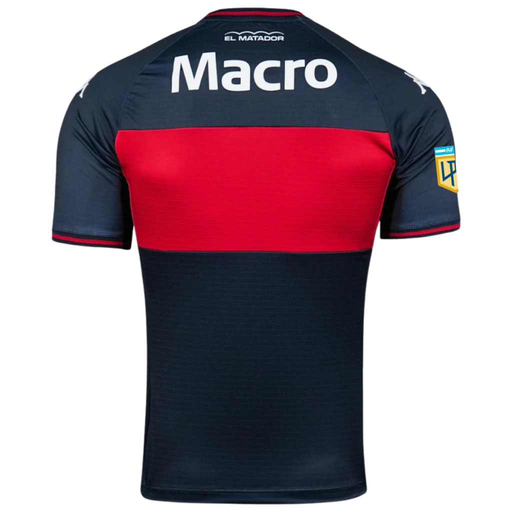 A nova camisa titular do CA Tigre apresenta um tom de azul muito escuro, quase preto, trazendo uma mudança marcante no visual. O destaque é o retorno da tradicional faixa horizontal vermelha no peito, após um ano em que ela foi usada na vertical. A gola é redonda e conta com uma faixa vermelha centralizada, detalhe que se repete nos punhos. Na parte de trás da gola, o apelido “El Matador” aparece em branco. O escudo do Tigre está posicionado no lado esquerdo do peito, enquanto o logo da Kappa, em branco, aparece no lado direito e nas mangas. Os patrocínios também seguem na cor branca, mantendo a harmonia do design. Nesta versão a camisa acompanha o patch de participação no Campeonato Argentino.
