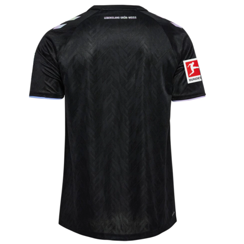A nova terceira camisa do Werder Bremen traz o preto como predominante e traz no corpo o padrão estilo anos 90 que a marca dinamarquesa tem adotado em seus mantos. As faixas laterais e os chevrons trazem um gradiente reflexivo, que simula as cores da noite da cidade.A Hummel estampa seu logo em cinza, no lado direito do peito, enquanto o escudo do Werder Bremen é colocado no lado esquerdo, numa versão cinza vazada. Nesta versão a camisa acompanha o patch de participação na Bundesliga 2024/25.